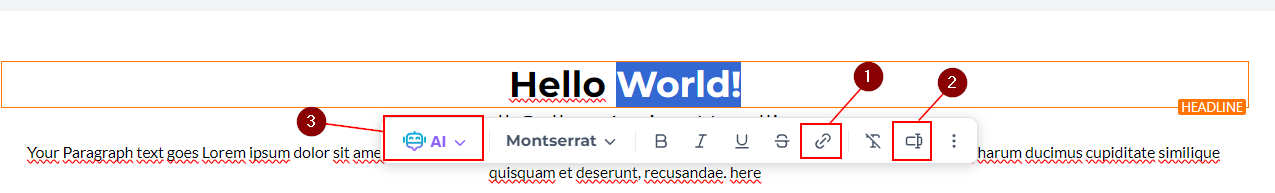 When text is selected, the Custom Data Option Picker will hover over it. With this toolbar, you can add links (1), custom fields or values (2), or rewrite the text using AI (3) by clicking on the corresponding options. Furthermore, you can utilize the toolbar to adjust the font and styling options of your text.