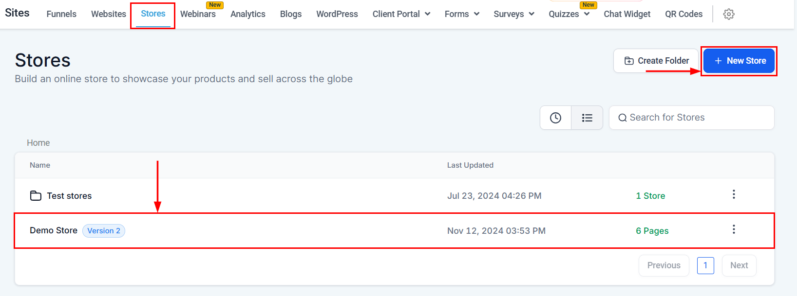 Navigate to the Sites > Stores section in your account, and proceed to create a new store, or click an existing store to modify it.