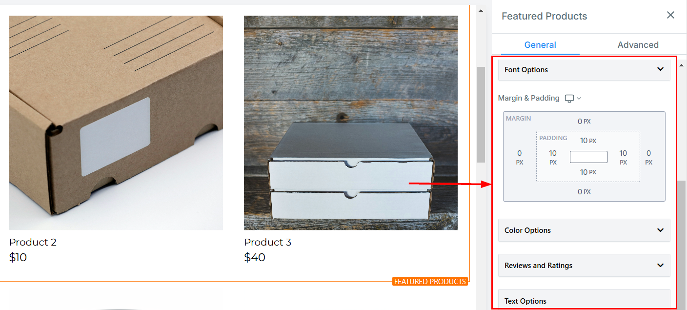 Customize the heading, margins, padding, colors, borders, and fonts for a cohesive look. Additionally, choose whether to display reviews and ratings for the selected products to further market your offerings.