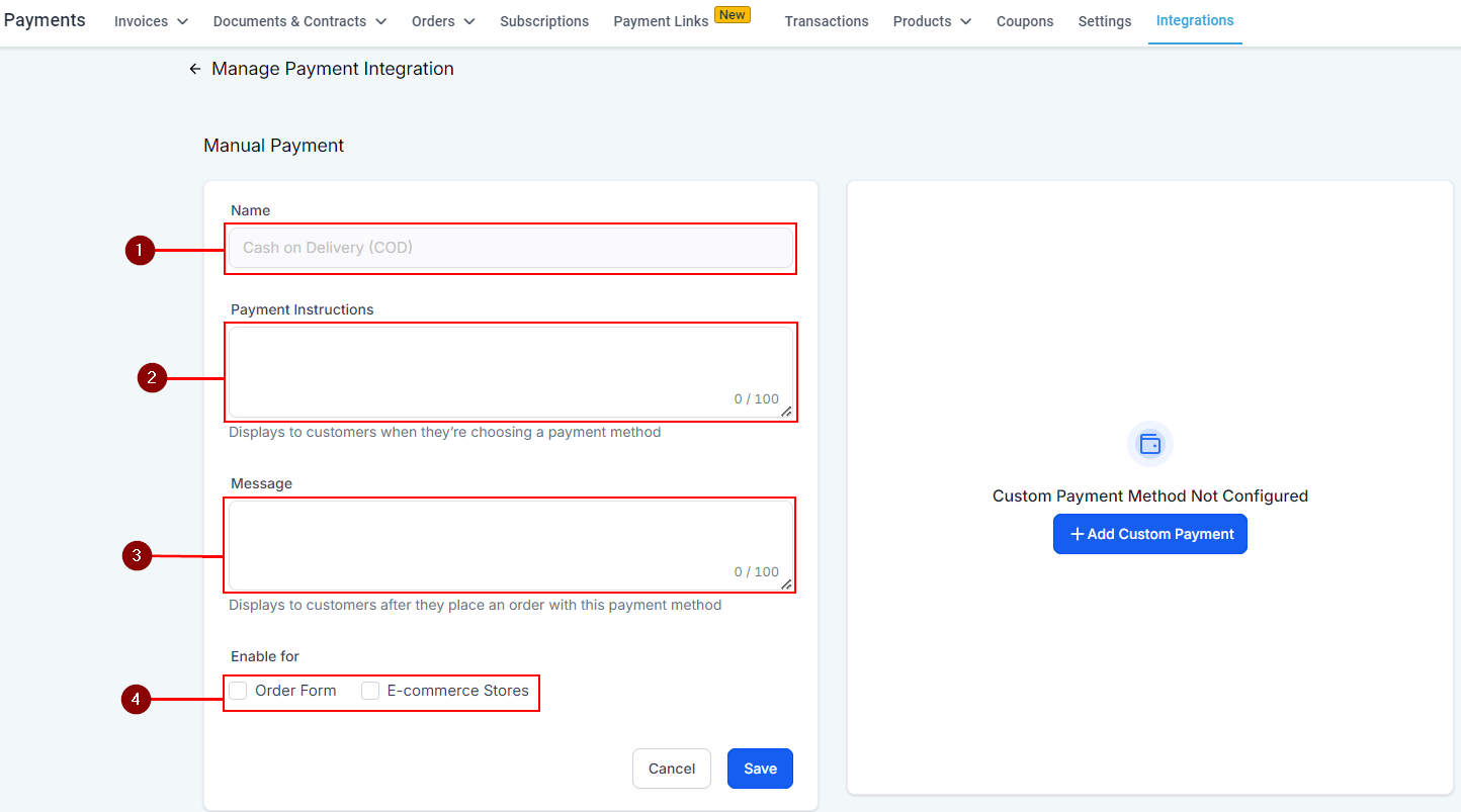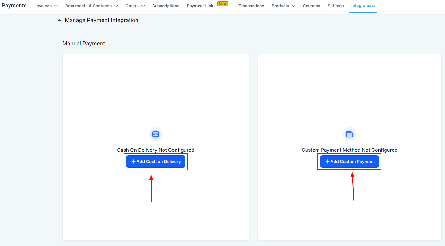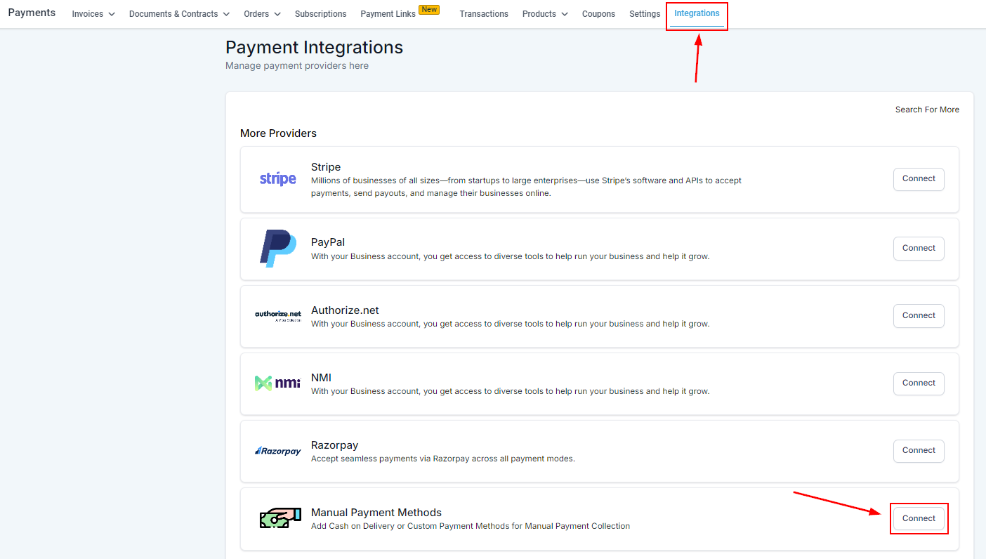 You need to access the Integrations tab inside your Payments section to enable the Manual Payments. In there scroll down to Manual Payment Methods and click Connect.