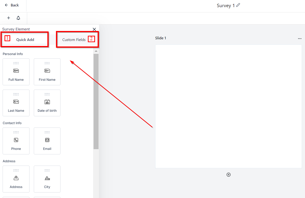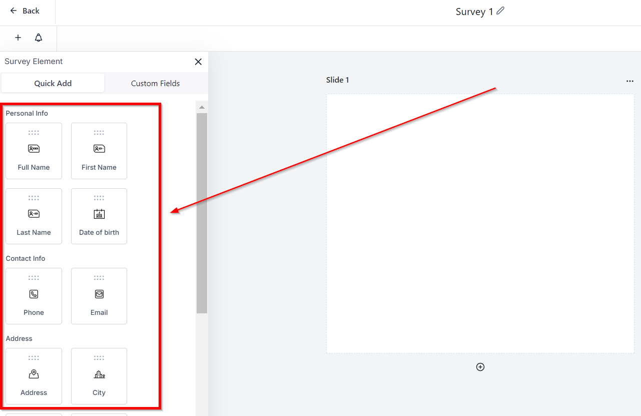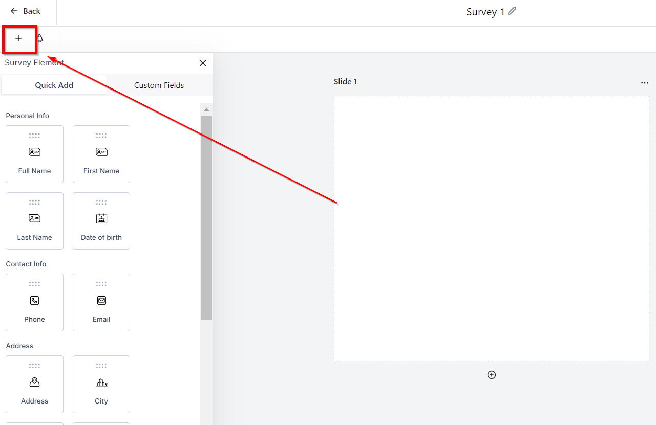 Navigate to the "+" tab to see the different survey fields you can use to customize your surveys.