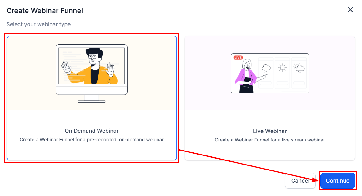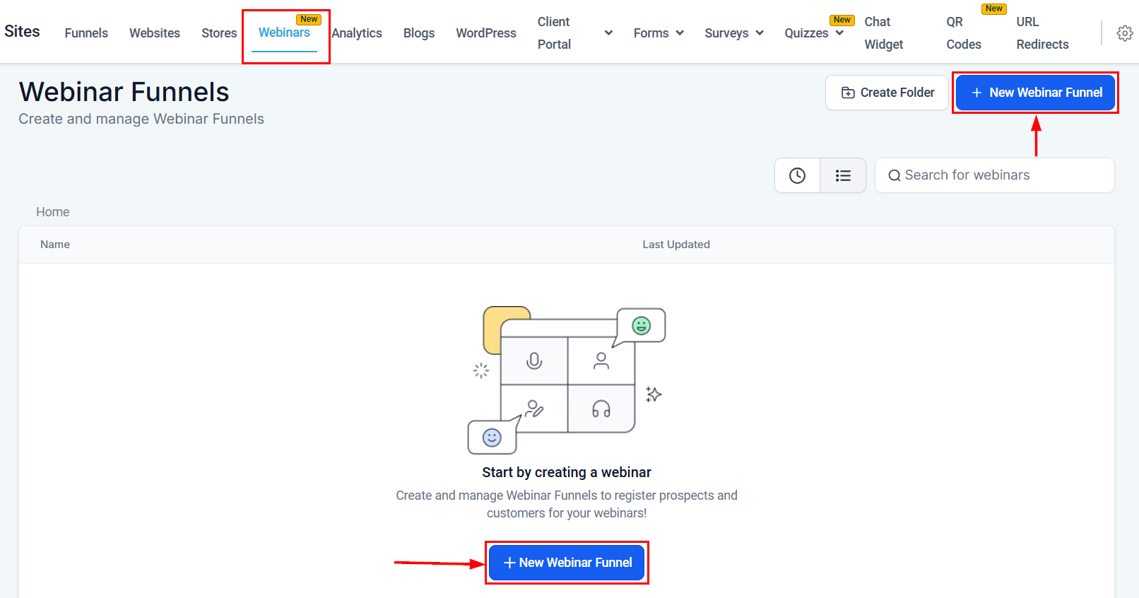 To create an On-Demand Webinar, navigate to the Webinars tab within Sites, then click the New Webinar Funnel option.