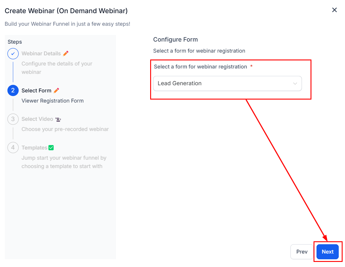 Next, select the form to be used for the webinar registration of your guests, then proceed to the next step.