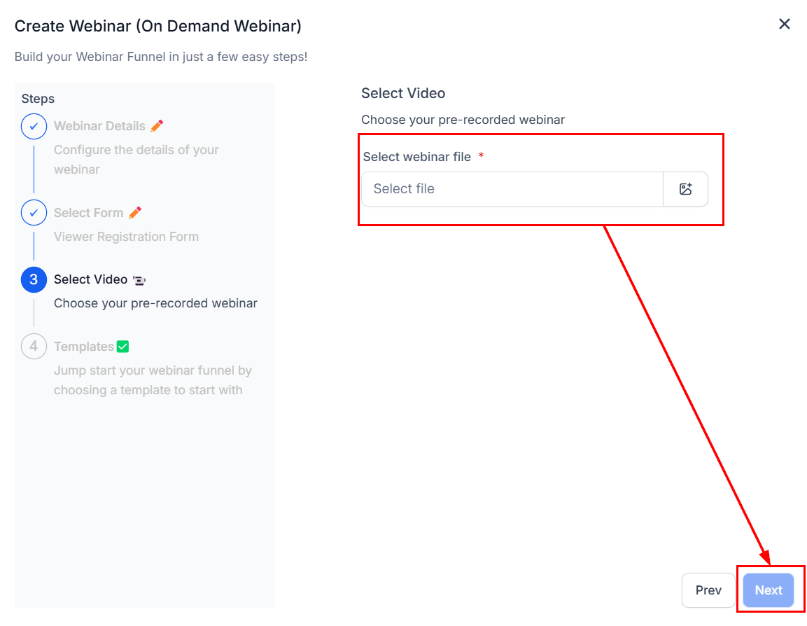Choose your pre-recorded webinar from the Media Library. If the file is not already available, upload it to the Media Library as needed.