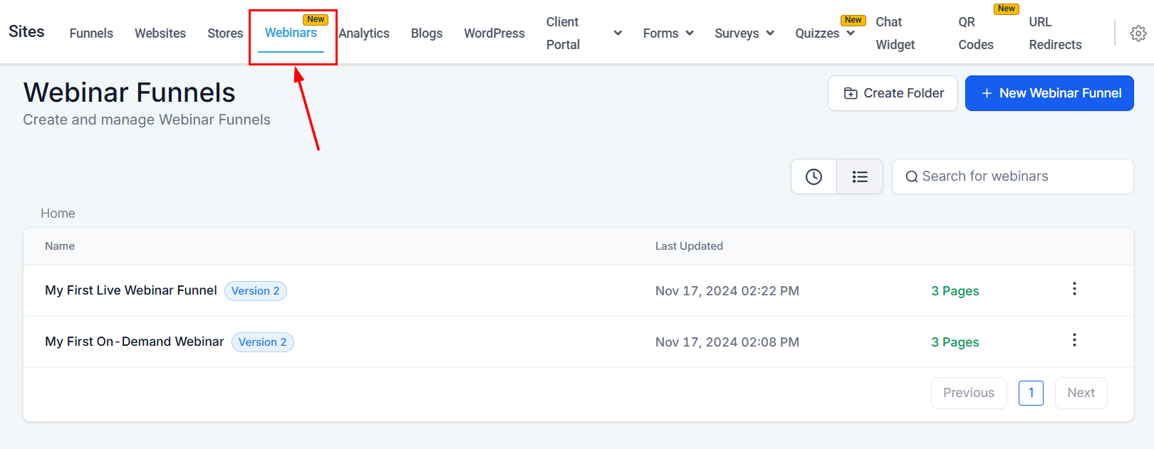 Start by navigating to the Webinars section within Sites. Within this section, you can create new webinar funnels, or manage existing ones.