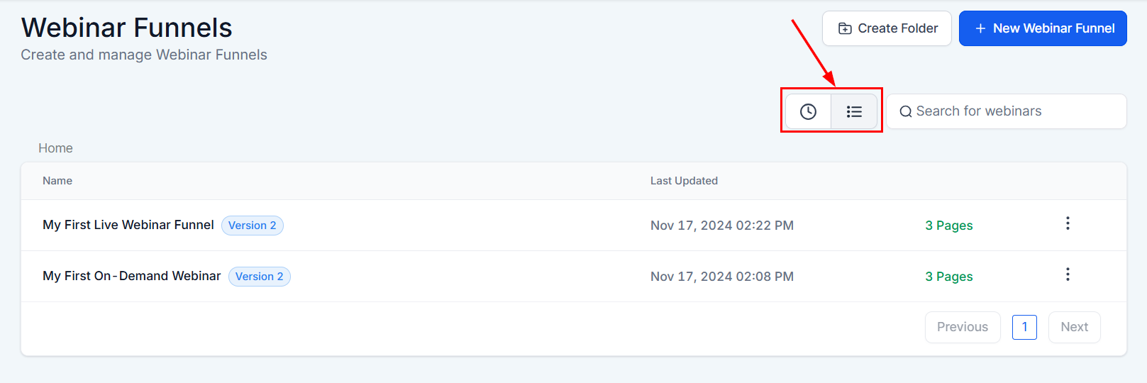 Display your webinar funnels in either List View (sorted alphabetically) or Recents View (sorted by the most recent date and time of updates).