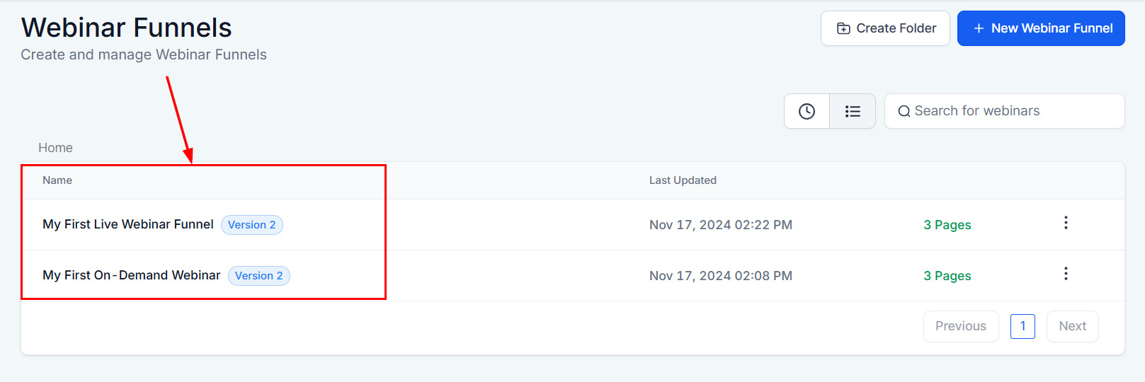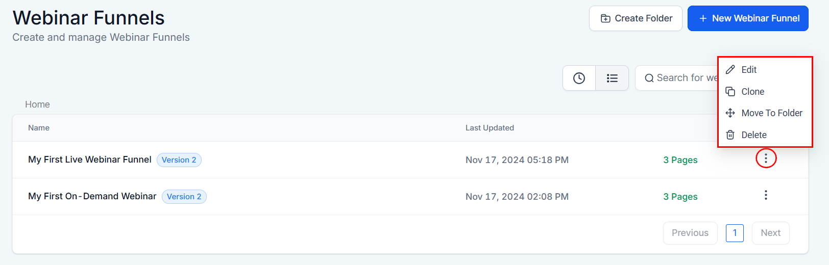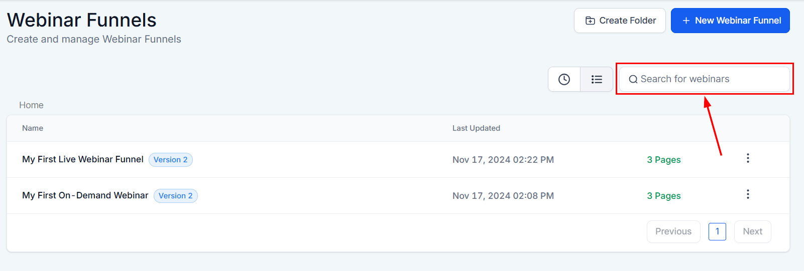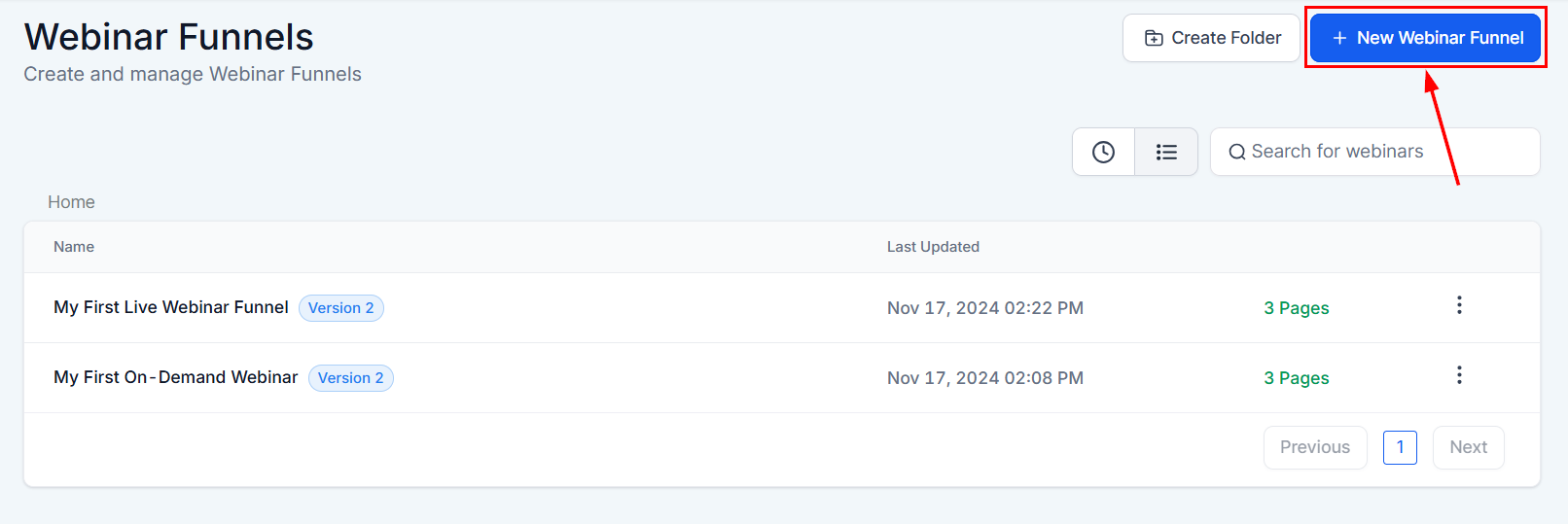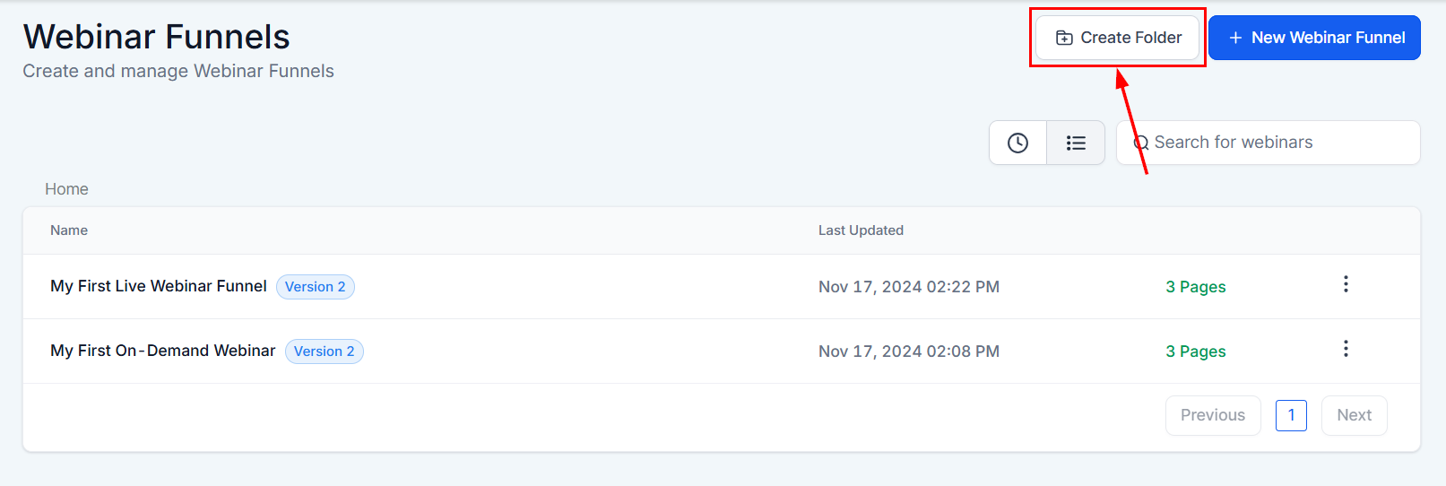 The Create Folder button enables you to efficiently organize your Webinar Funnels into categorized groups, allowing for greater organization based on your specific preferences.