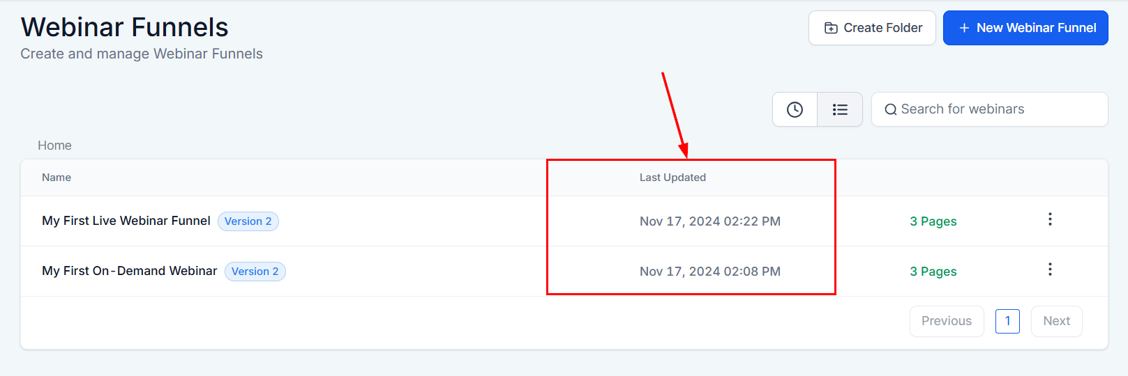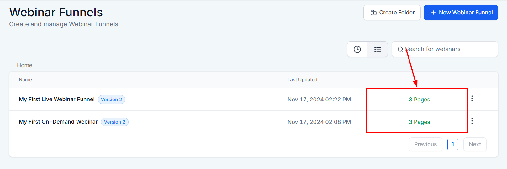 The column next to Last Updated indicates the total number of pages included within each webinar funnel.