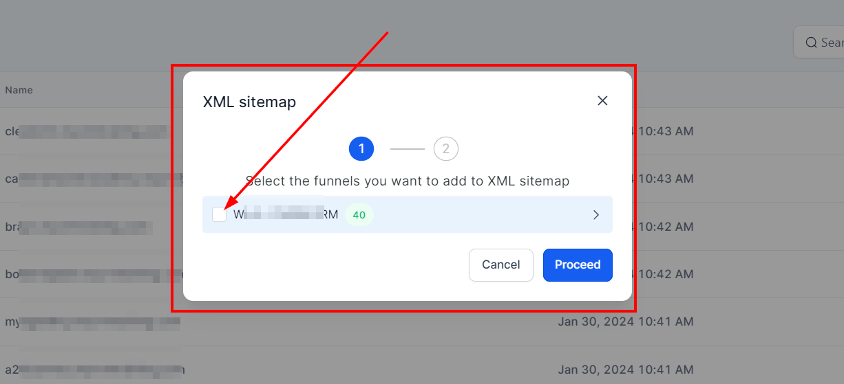 When you click on XML sitemaps, it will open a popup with the sitemap generator that will show you any websites or funnels attached to the domain that you can select or deselect. If you open up a funnel or website, itβll show you the pages within it and you can select or deselect the pages you want included in the sitemap. Hit the Proceed button