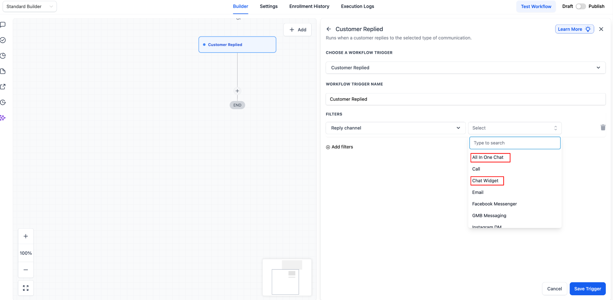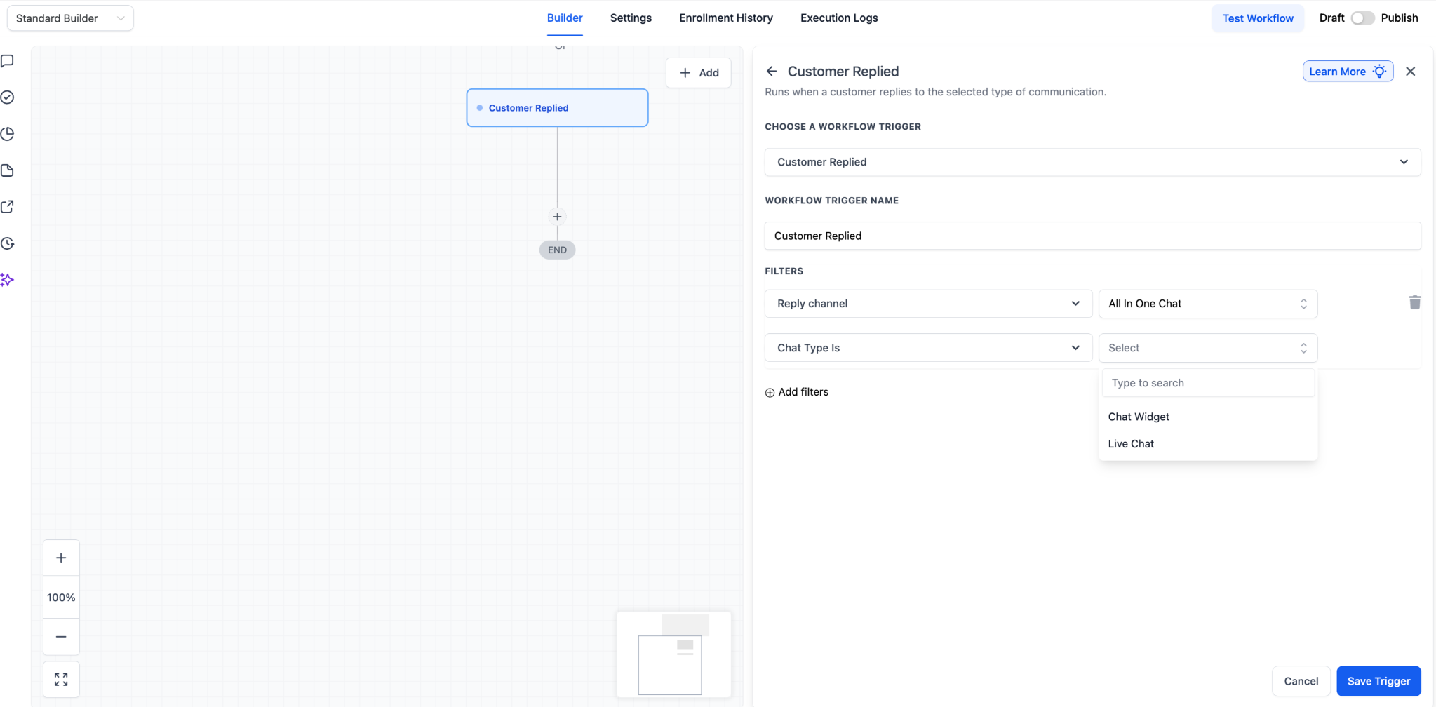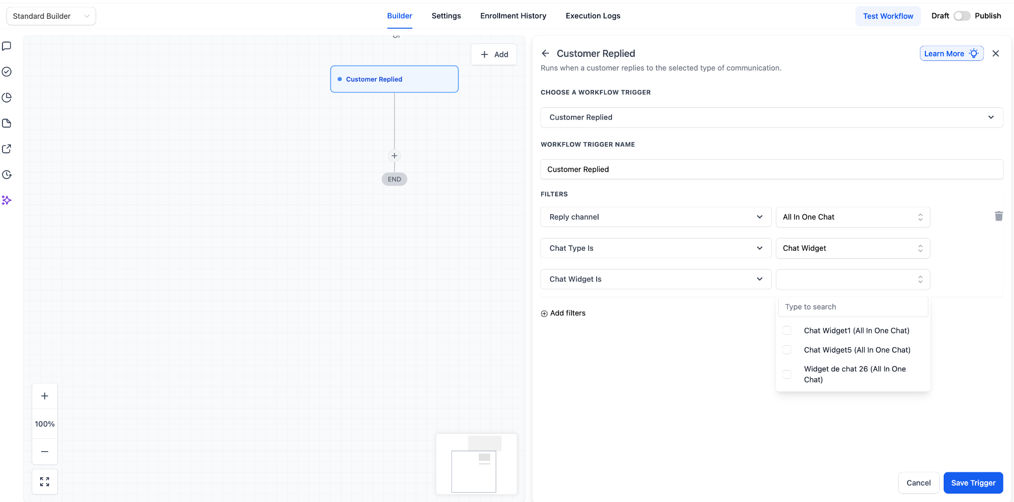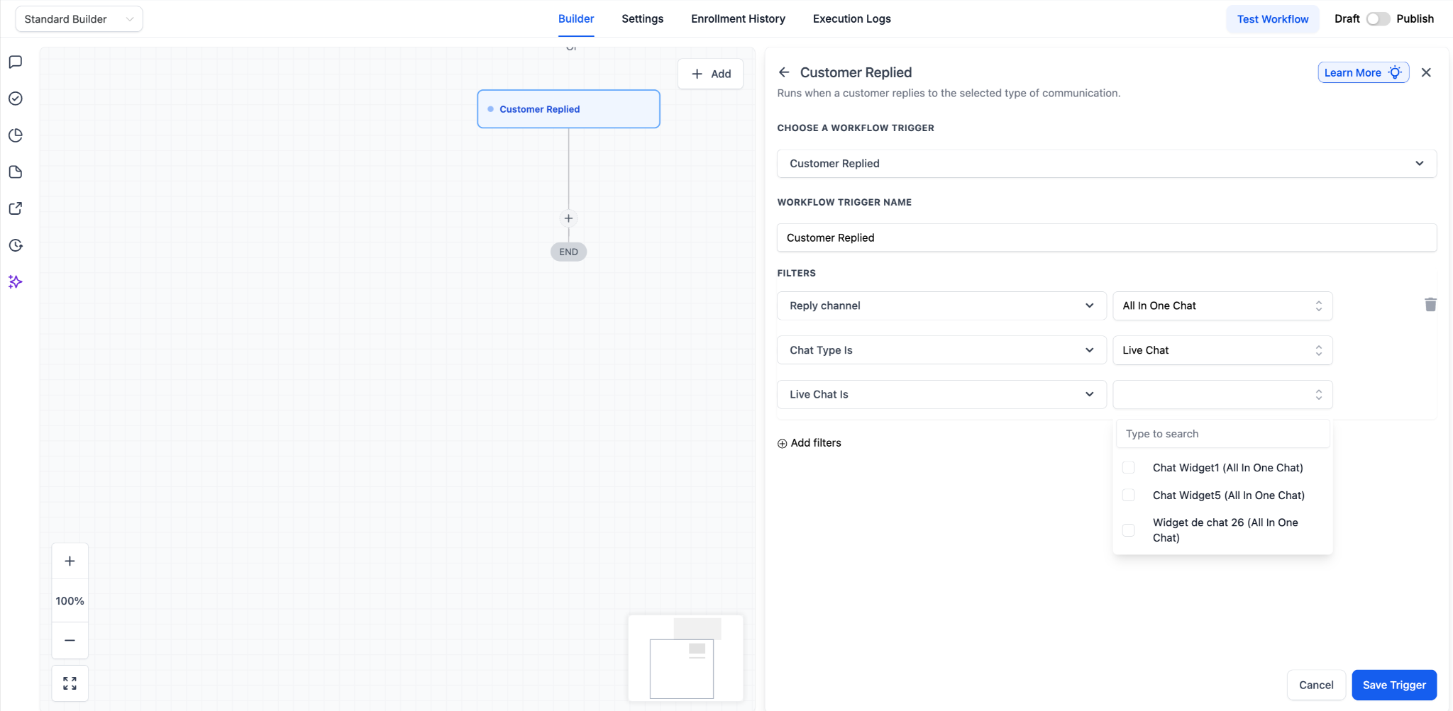 Now, the workflow will only run when a customer replies through the selected All-in-One Chat configuration.