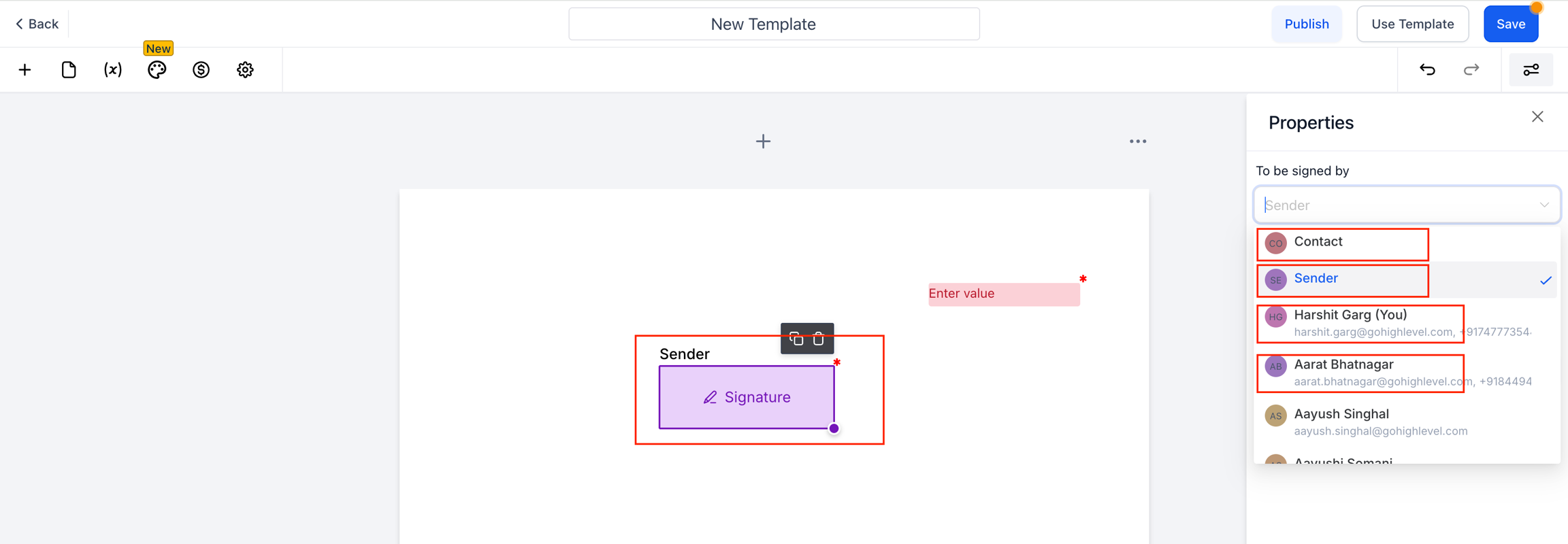 Earlier, while creating a template, Admins could assign signature fields only to: